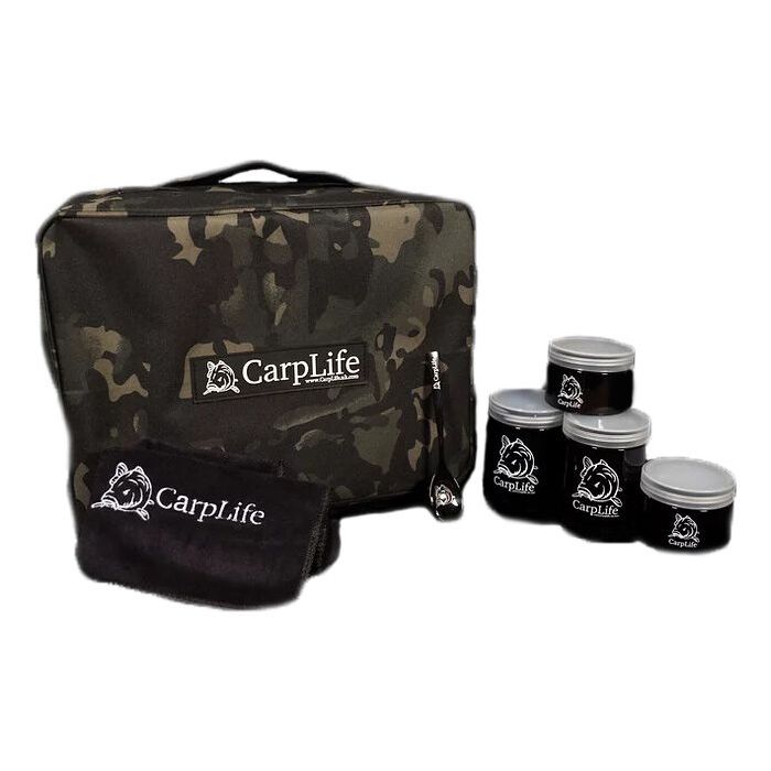 Supplied with a handy CarpLife Microfibre Hand Towel, Black Etched Tea Spoon and 4 food grade CarpLife pots for tea, coffee, sugar and seasoning.