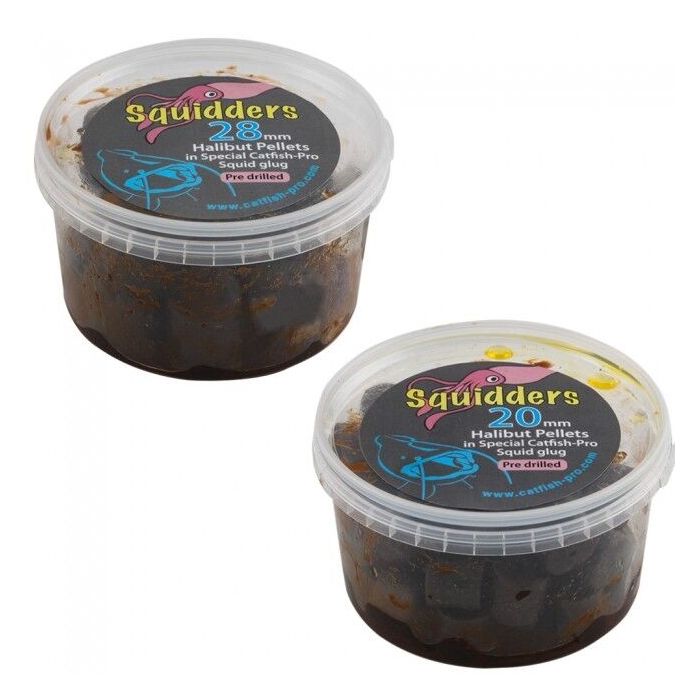 Pre-drilled halibut pellets glugged in a special squid flavoured formula to use as hookbaits for catfish. The extra attraction of the glug helps make the fish take your bait first! Supplied as approx 300g of bait in a handy tub. Size 20mm and 28mm.