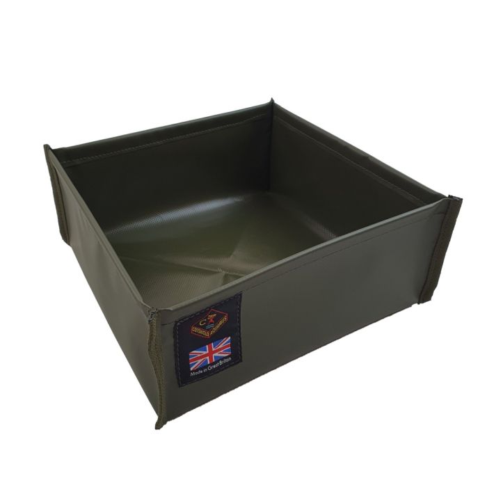 A square bowl that folds flat or convenient storage. Made from an easy clean PVC, great when using groundbait etc. All in all a very useful item, ideal for bait or an on the bank tackle and bits container. Available in two sizes: 10″ x 10″ and 14″ x 14″.