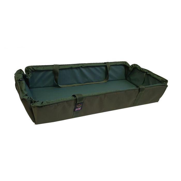 The mats can be used flat but also have the ability to be transformed into a cradle style with drawstring foam walls held securely in place with cord locks. Webbing handles either side allow the fish to be safely lifted and carried. There are three pegging points allowing security in windy conditions. The mat itself rolls up making it very compact an easy to transport. There is a webb carry handle and adjustable shoulder strap constructed from our hardwearing material on the outer and soft fish friendly wipe clean material on the inner. Sandwiched between this is a thick layer of soft foam. All in all a very robust, practical and safe system available in our Olive or Woodland Camouflage material.