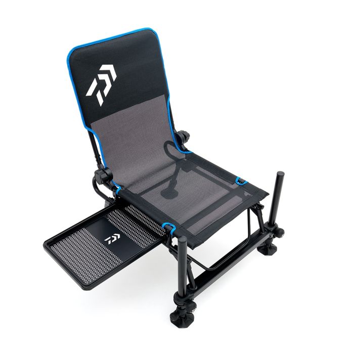 Designed around SYSTEM 36 this feeder chair features a Slide Tray underneath. Protruding to the left or right side it can be locked into place. The trays ridge rail will also accommodate a sliding clamp and leg if preferred, then allowing addition of other parts and accessories to tailor your set up. The 36mm extending/telescopic front legs compatible with all SYSTEM 36 accessories. Large tilting mud feet and adjustable seat featuring quick dry vented mesh, ensure All Terrain stability and comfort are assured.