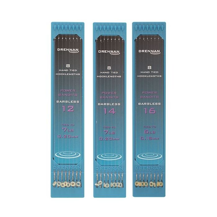 The Barbless Power Hair Rigger hooks used on these Power Bandit hook lengths have an acute upturned eye this sits the hook dead straight on the hook link providing improved presentation and hooking ratios. The bait band can be stretched around pellets or pulled inside drilled pellets and soft baits like sweetcorn and meat with a bait needle.