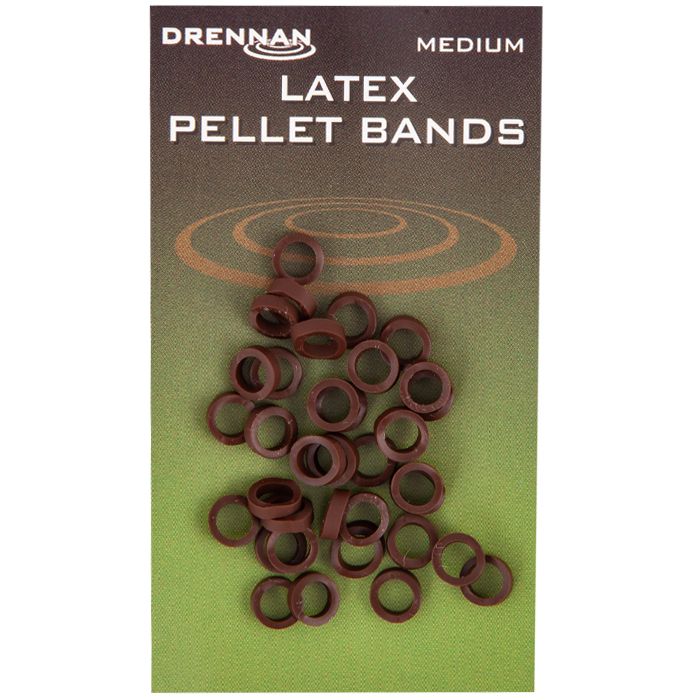 Drennan Latex Pellet Bands, Now available in either dark brown or natural latex colour. These latex bait bands stretch more and grip better than previous versions and are flexible enough to be pulled through drilled pellets using a baiting needle. Pre-cut ready to use and, by buying the appropriate sized bands, they will fit all sizes of pellet. Approx 30 bands per wallet in the 'pellet brown' colour, and approx. 50 per wallet in the natural coloured latex packs.