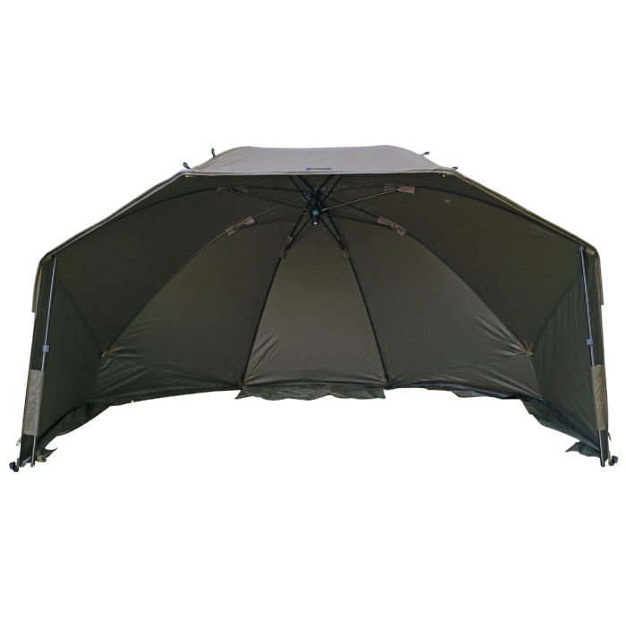 The brollys feature a dark olive green 210d cover with 5,000mm hydrostatic head. The inner surface has a lightproof laminate to minimize sunlight ingress. The frame is made from ultra strong and sturdy 8.5mm fibreglass ribs and features a space saving locking mechanism which maximises headroom even when the brolly is set low.