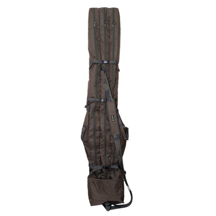 The roomy base pocket on the outside that can accommodate a brolly, landing net, retainer sling plus bank sticks and storm poles etc. These are held in place by triple cross straps that can be cinched up tight keeping everything secure.