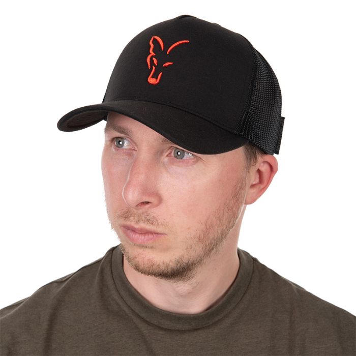 The Fox Collection Trucker Cap Black/Orange a smart all black baseball cap with orange fox detailing. With mesh air flow panels to help you keep cool and an adjustable snap adjuster.