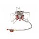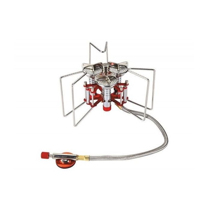The ultimate in power this light, compact stove burns vapour and liquid gas via a remote GoSystem EN417 gas cartridge. Featuring a newly developed triple burner head with precision flame control, it can boil half a litre of water in just 57 seconds. The wide serrated sprung pan supports and legs fold in and along with the easily coiled braided hose create an easily "packed away" unit ready for transportation. Comes complete with carry/storage stuff sack.