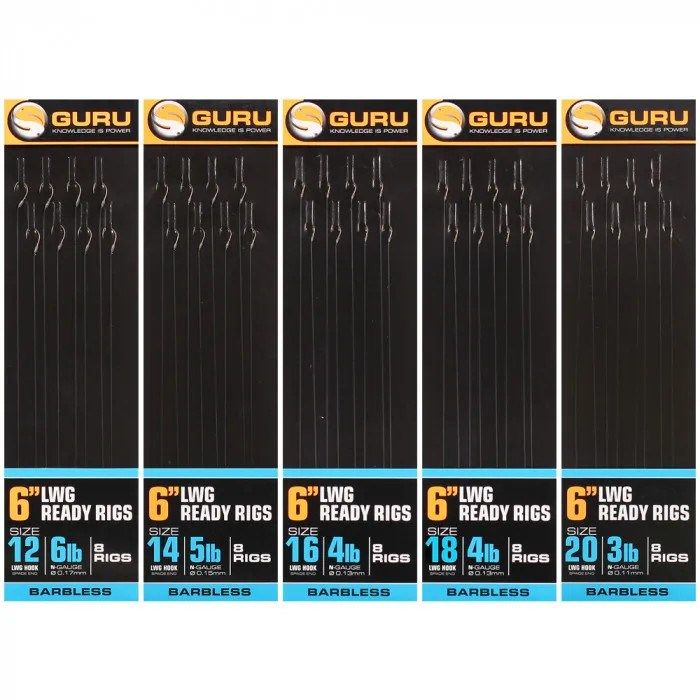 Guru's LWG Ready Rigs, 6 Inch ultimate all round hooklengths designed cover pretty much every pole angling situation. Featuring perfectly tied spade end hooks, probably neater than you could tie up yourself, and with a figure-of-eight loop knot at the other end for easy attachment to your line. They arrive neatly packaged on cards making them easy to use, with no knots as you try to unravel them, plus they will even fit into their cases.