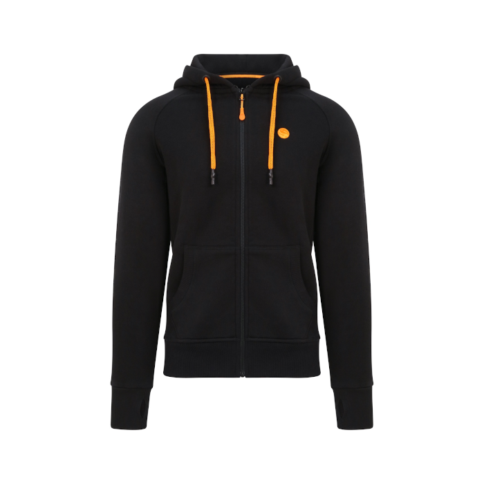 A fetching all black zipped hoodie with striking orange pull cords on the hood and a small guru emblem on the chest. There’s a large grey Guru logo on the back and further branding on the left sleeve. With an elasticated waist and cuffs for a snug fit.