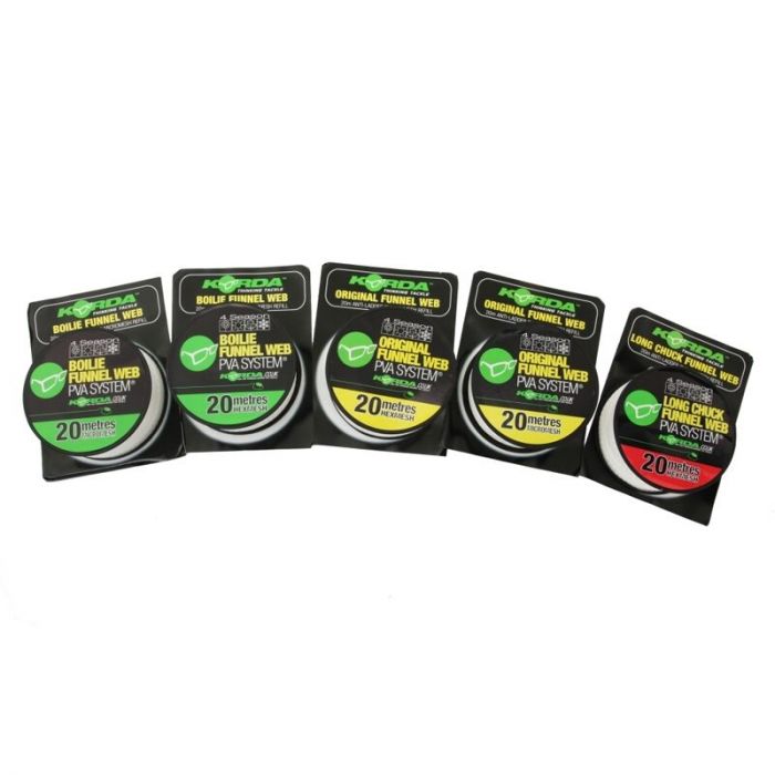 The Boilie Funnelweb is slightly narrower than the original Funnelweb, making it ideal for situations when you have to cast further. Two or three baits placed into a PVA bag can be very effective – just enough of a mouthful to create a take without overfeeding. You don’t just have to use boilies, though, you can place maggots, micro pellets or crushed baits inside when using the micromesh version. Not only that, you can create the ultimate PVA sticks. Just like the others, the system comes complete with a compressor stick to create the tightest sticks. You receive 7 metres of PVA on each system and the tube comes colour-coded to help match the refills correctly.