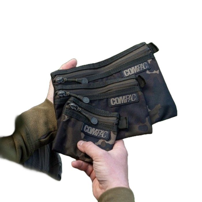 Korda Compac Wallets Set of 3 - Dark Kamo, The Compac Wallets come as a set of three, designed to provide a neat storage solution for your angling essentials. They come in small, medium and large, with the small perfect for storing items such as charging cables, memory cards and spare batteries, the medium is ideal for spare packets of hooks and smaller terminal tackle items. The large is great for storing PVA bags, spare leaders and hooklink materials, along with everything in between. Each pouch has been optimised to work in conjunction with the Compac Tackle Pouches and will each fit snugly into the following: Small - Compac 100 Medium - Compac 125 Large - Compac140 They can of course be used independently as theyve been constructed from durable, water resistant, 600D dark kamo fabric.