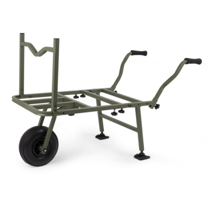 A barrow purpose built for the mobile angler. Has an extending frame which makes it compact in transit, but still gives a large footprint for carrying bulky items like beds and chairs. Frame folds smaller than most carp barrows thanks to this unique design. Barrow upright includes two uprights for hanging buckets and bags. It also stops your rod bag sliding from the barrow. Complete with comfortable foam handles, hard wearing tyre and large Korum mudfeet. H220 W83 D61. Transport size H29 W77 D58.