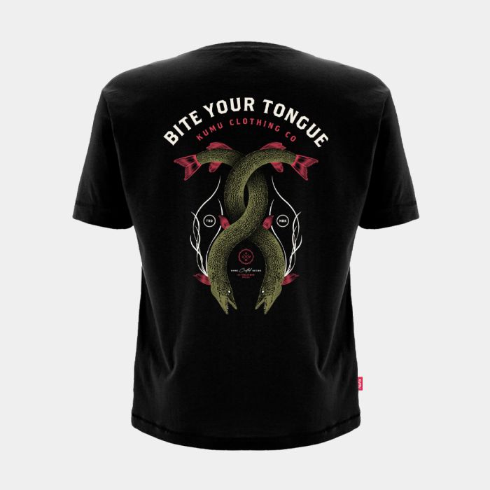 If you’re a predator angler, then you’re gonna’ want to sink your teeth into our Bite Your Tongue tee; symbolising 2 intertwined Pike hunting their prey. 4 colour screenprint on our new, super soft, 150g organic fabric with woven side tab detailing.
