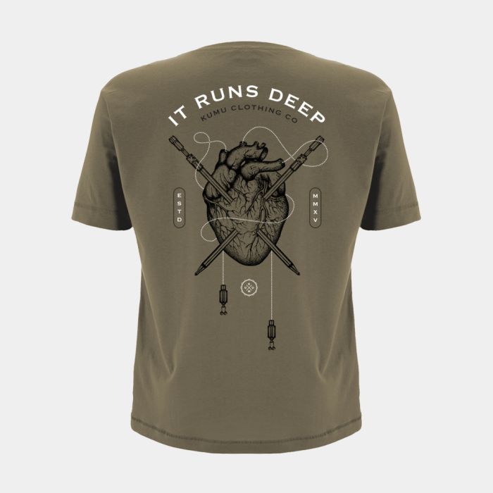runs in the blood. 2 colour screenprint on a super soft, 150gsm earthy ‘Ash Brown’ fabric with woven side tab detailing.