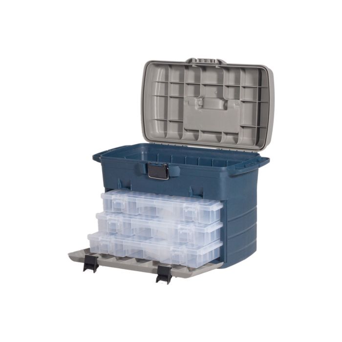 The Leeda Tackle Box System offers the ultimate storage and transit solution for any angler. Made using saltwater resistant clips and fittings and high impact resistant plastic, the tackle box system is the perfect choice for anglers who fish in fresh or saltwater. Also included in the box are 3 x large lure / tackle boxes with removable dividers to help carry smaller tackle items and accessories. The top compartment is large enough to hold large reels and bigger items such tools, a flask or lunchbox. The box also features a fully adjustable and detachable shoulder strap for comfort while carrying the box.