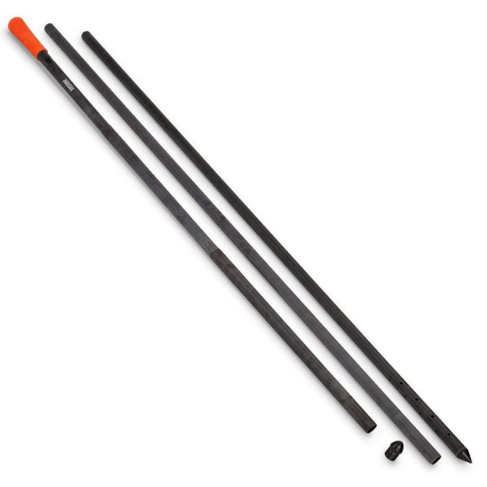 An updated design of the time served Nash Prodding Stick. Fibreglass sections with spring button locking allow the most accurate interpretation of the lake bed to quickly locate feeding areas, depressions and natural food larders. Holes in the bottom section ensure the stick is easy to manoeuvre even when using substantial numbers of sections in deep water. Choose the domed metal nose for feature finding or the pointed spike to adapt to a marker pole. A revised design top section features a high viz fluoro orange EVA sight tip plus a wrap of 3M Reflective Tape to allow easy night time location under head torch light. The updated design top marker pole now breaks down into three reduced length sections to allow your Prodding Stick to sit low to the surface over a baited area, reducing visibility to other anglers and removing a potential obstacle when lowering rigs from boats.
