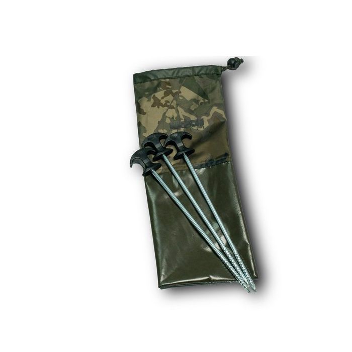 Hardened steel screw point bivvy pegs with moulded T grip. Available in 20cm and an extra length 30cm for soft conditions. 10 pegs per pack, supplied in a Nash camo print drawstring bag.