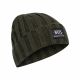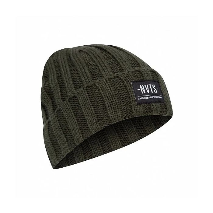 A warm winter hat made of thick knit in dark green color. It is a fashionable beanie especially in the UK, known as a docker style hat, which is short and slightly covers the ears. A subtle patch related to the Navitas brand on the front of the hat.