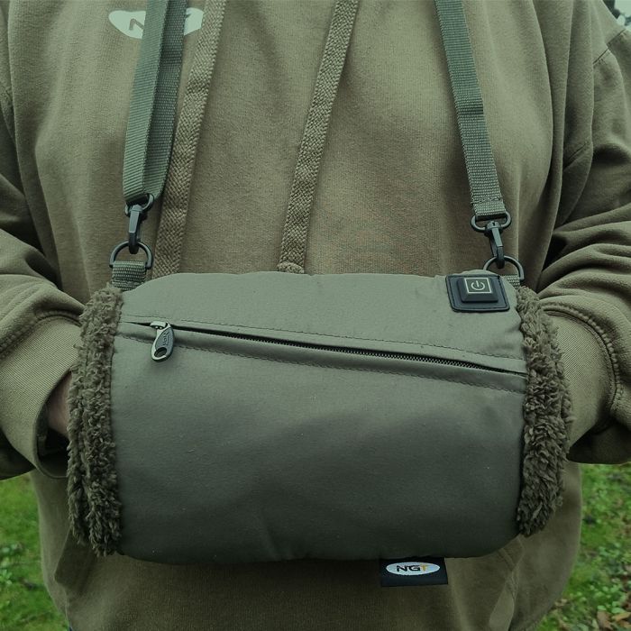 The hand warmer includes a zipped pocket to securely store your power bank (not included) and comes equipped with a USB-A connector for easy power access. Complete with a removable shoulder strap for support and carrying, it’s portable, convenient, and perfect for fishing, camping, or everyday use.