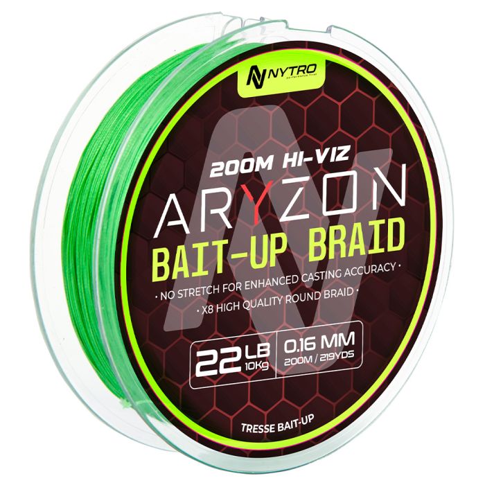 Nytro Aryzon Hiviz Bait-Up Braid 200m, High-quality, Aryzon Hi-Viz Bait-up X8-strand, super smooth, round braid, has been designed for use with baiting up reels. Featuring no-stretch, for more accurate casting as well as emptying your bait-up feeder on a simple pull back. It has a smooth medium-pitch surface, high tensile strength, superb knot strength and of course is abrasion resistant. The no-stretch function of our Aryzon Hi-Viz Bait-up braid results in improved power transfer, where more power is directly transmitted from the rod to the bait-up feeder. This efficient power transfer enables the angler to cast heavier loads further, which is essential for reaching distant baiting areas.