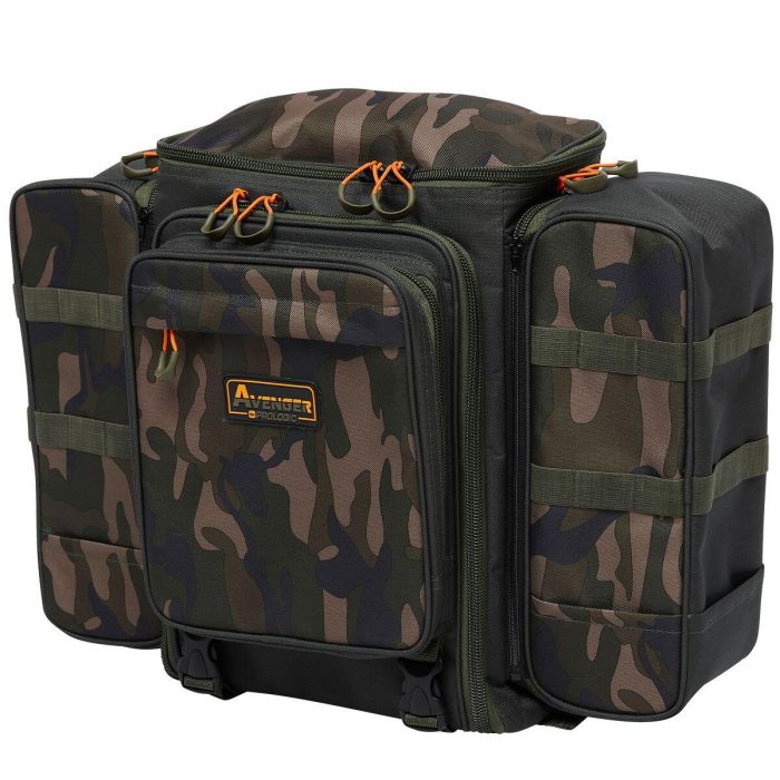 The Avenger rucksack comprises of a main middle section for large items such as cooking equipment, sleeping gear, larger clothing, a separate zipped compartment on top of the middle section ideal for small tackle items, as well as two detachable storage pouch on either side of the middle section of the rucksack, ideal for tackle boxes and quick access items.