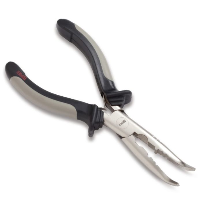 The most popular size pliers, these curved nose models help get at hard to reach hooks. Nickel plated carbon steel they include split shot crimper, a side cutter and a double leaf spring for easy, one handed operation. Also includes handy Patented Rapala lure tuning tool.