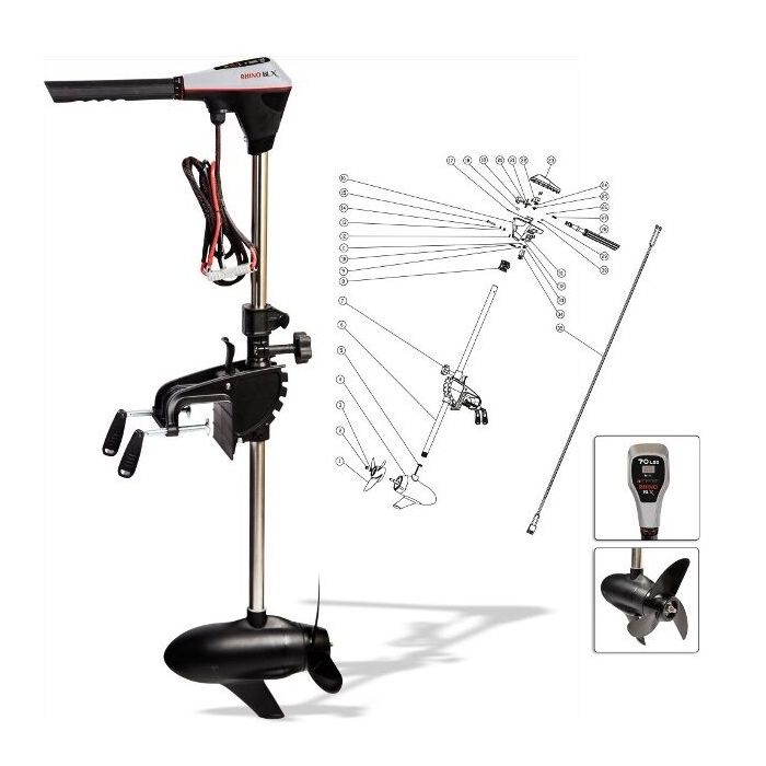 The Rhino BLX 70 electric motor is a powerful motor with a thrust of 70lb operating at 12V. The 70lb produced by the electric motor is approximately equal to 2HP. The motor is maintenance free as there are no carbon brushes. In addition, the BLX has a Sport mode which ensures that the motor immediately runs at top speed. The motor is also equipped with the Vario Speed principle, which allows you to adjust the motor speed, both forwards and backwards. By means of a lever system, the engine can easily be folded up. Finally, this engine has some very useful special features. For example, the display shows the state of the battery, the Motor is equipped with a USB connection so that all your electricity can be charged easily, the steering handle can be pulled out to the desired distance (made of stainless steel so that it does not bend) and the depth of the propeller can be adjusted.