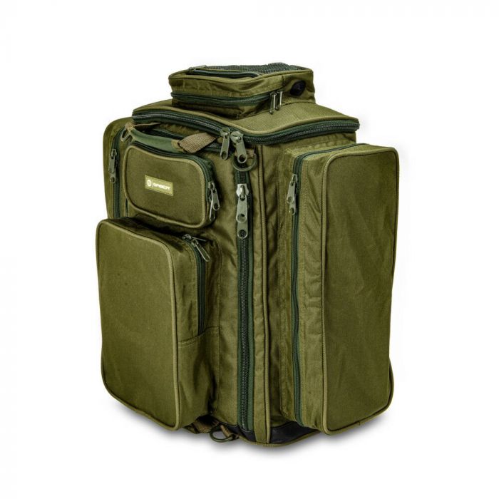 The top pocket is complemented by tackle pockets on 3 sides. The front pocket is designed to accommodate leading tackle boxes and the side pockets effortlessly swallow banksticks (complete with alarms), rig wallets etc.