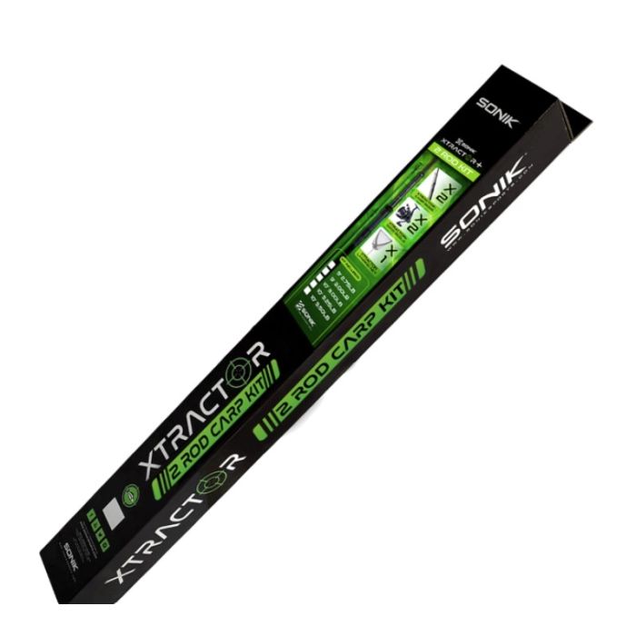 Sonik Xtractor+ 2 Rod Carp Kit, The Xtractor+ carp kit is an updated version of the original and makes the choice easy for anglers looking to join the mobile carp fishing revolution! Ultimate convenience, exceptional performance, maximum value these new kits feature the awesome new Xtractor + rods and reels, plus an Xtractor 42 net. Available in both 9 and 10 lengths, these kits are ideal for anglers needing a ready-made, well balanced set up at an affordable price!