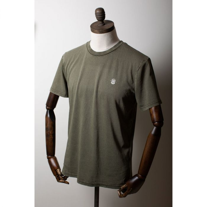 Small breast print, and woven hem detail. White print on an aged olive tee. Fair Wear Approved and 100% Ring Spun combed Organic Cotton