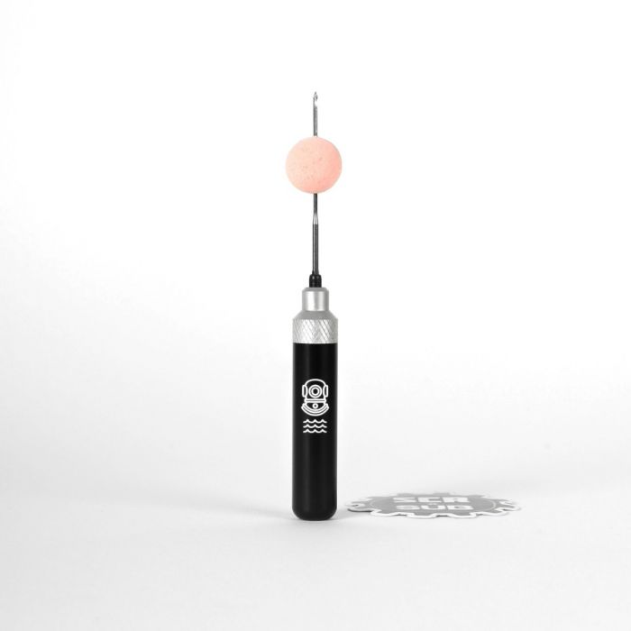 The body is made from a black anodised aero-grade aluminium, laser etched with our diver icon, and capped with a silver anodised knurled head section. The two piece design means that the body can be unscrewed, so you can interchange the fine needle for any other Solar system needle (fine/stringer/drill etc) or replace it in the event that it is broken - no more plastic throwaway needles, this one is built to last.