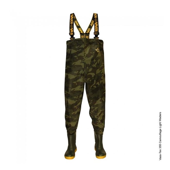 Vass are pleased to introduce the new Vass-Tex 355 ‘lightweight’ Camouflage chest wader. This wader is a ‘Camouflage’ version of the popular ‘plain Khaki Green Vass-Tex 350E Lightweight wader’. Therefore, the Vass-Tex 355 ‘Camouflage’ wader benefits from the usual high quality workmanship and raw materials anglers have come to expect from Vass. The upper part is more than 50% lighter than its Camouflage brother the ‘Vass-Tex 800 Heavy-Duty wader’. This wader was developed for anglers who require a lighter, more supple and compact (when stowed away) chest wader. It’s lightweight and flexibility is ideal for the warmer months as well as taking abroad on fishing trips. Although not as hard wearing as its heavy duty Vass-Tex 800 Camo’ brother, it retains reliability unrivalled by other lightweight chest waders in its class!